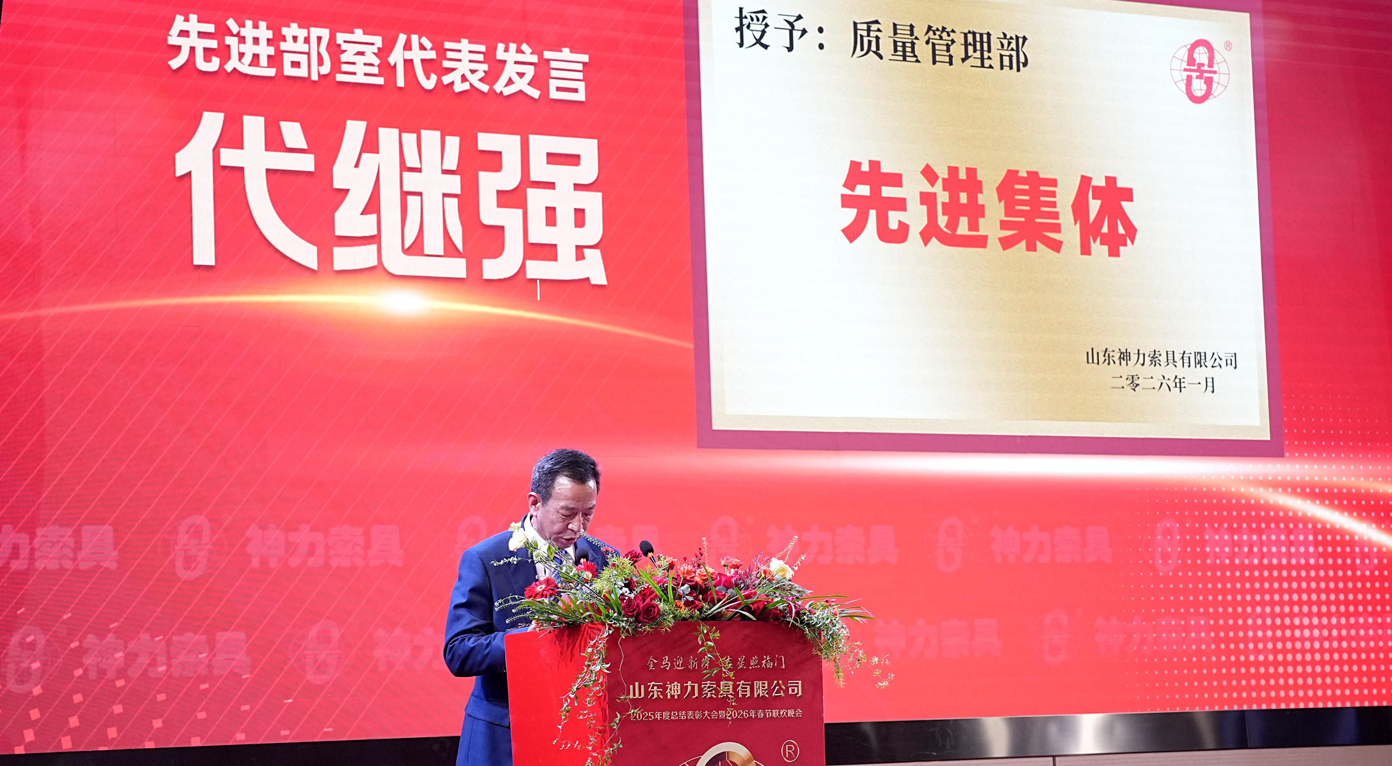 下午3时,神力索具二零二五年度总结表彰大会在雄壮的国歌声中拉开帷幕。神力索具党委书记杜亚中、董事长兼总经理杜大平、先进分厂(部室)、先进班组、先进个人及分厂副主任以上干部,同时还邀请了优秀员工的父母齐聚一堂,共襄盛典。
